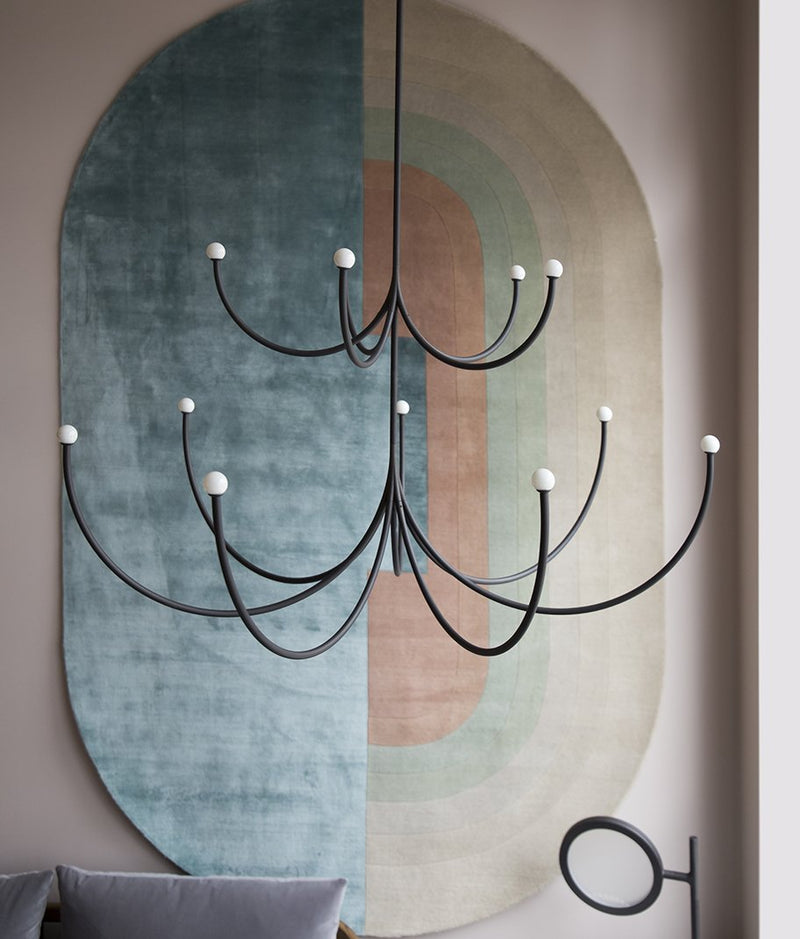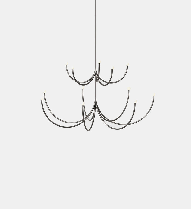 Arca is a lighting system whose form is a play of contrasts between the classical swooping branches and the spare minimalism of its linear, black composition. Tiers can be easily added together to create a unique chandelier.