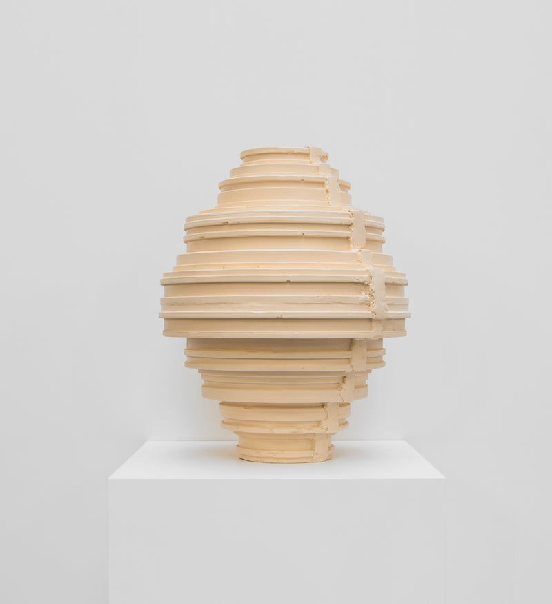 This collection deals with a production process inspired by the traditional plaster dragging technique in which the plaster is constrained in shape by a profile while hardening. This technique, traditionally used to produce ornamental cornices, is adapted here in order to serially produce various typologies of objects. The process results in an infinite variation of shapes based on solids of revolution.