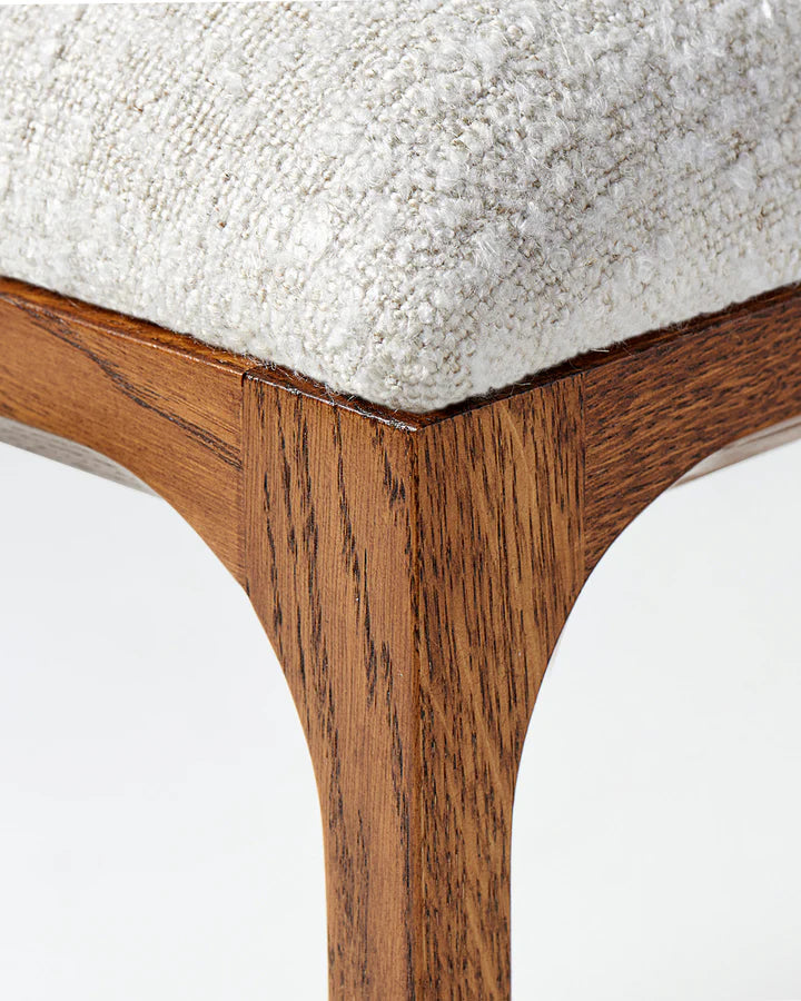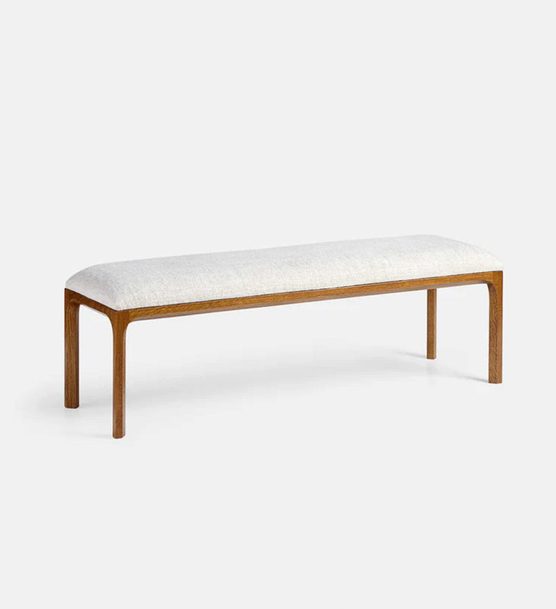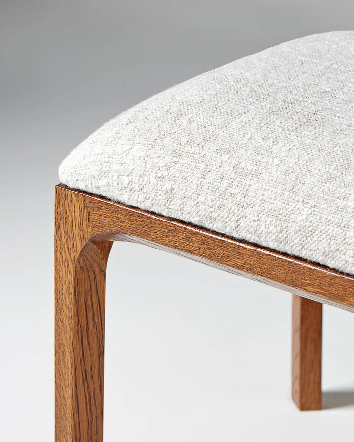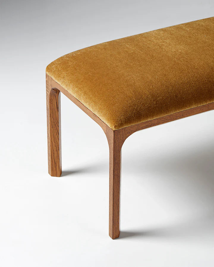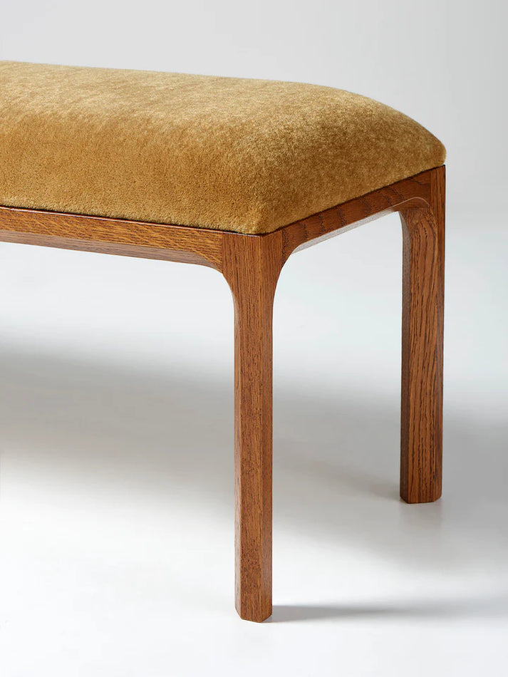 Kai Kristiansen, a key figure in the Danish Modern movement, designed the iconic Entre Series in 1956 as a modular collection of bedside cabinets, benches, and chests. Kristiansen's work balances contemporary and classical styles with elegant details. This bench, which features his signature chamfered legs, combines fumed oak with Pierre Frey's Teddy mohair velvet and beautiful woven Arsene fabric.
