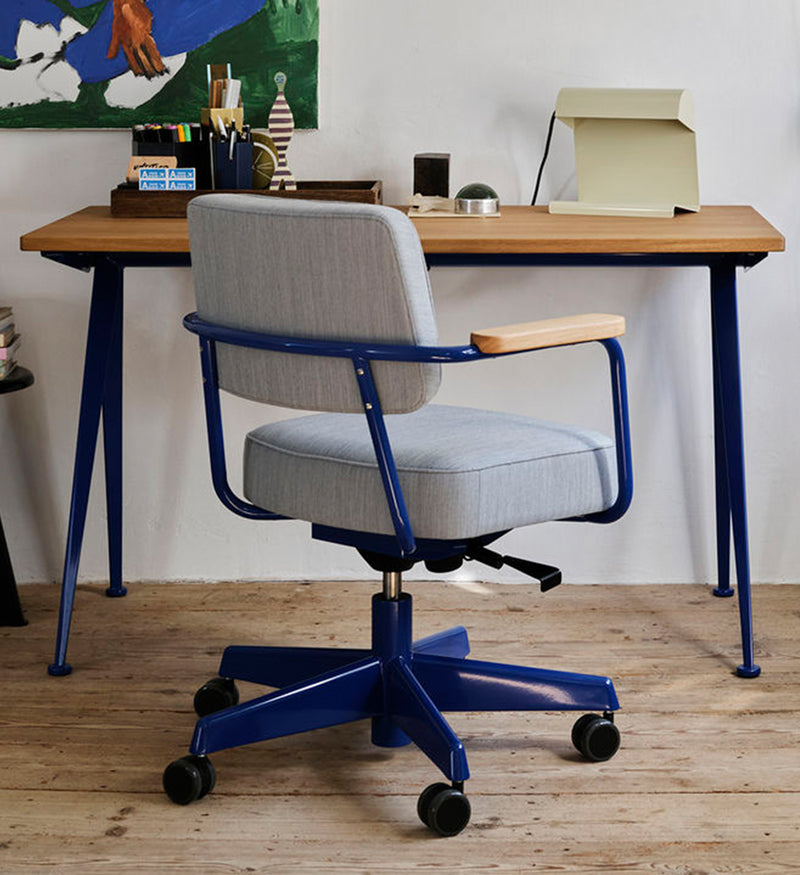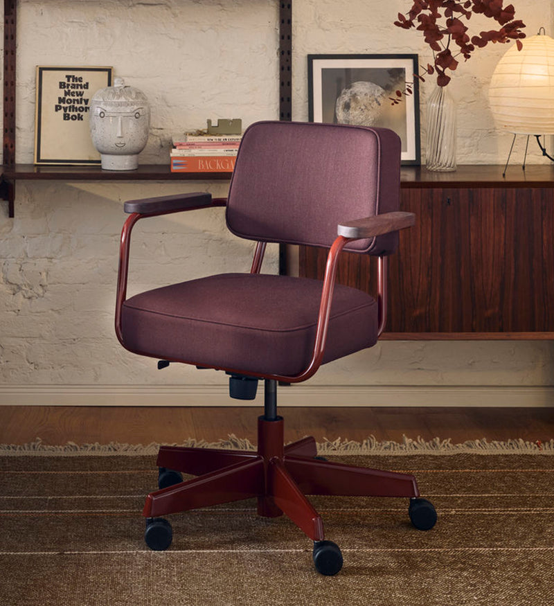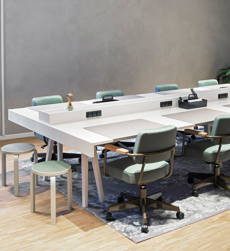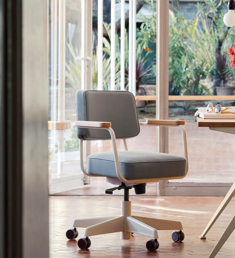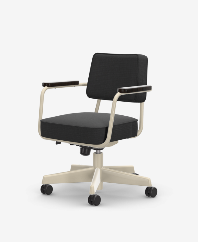 Seat and backrest: polyurethane filling; cover in fabric or leather. Armrests: solid wood with oiled finish; natural oak, smoked oak or American walnut. Base: five-star base made of bent sheet steel and tubular steel, powder-coated (smooth). Equipped with double castors in basic dark, Ø 60 mm.
