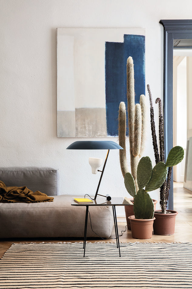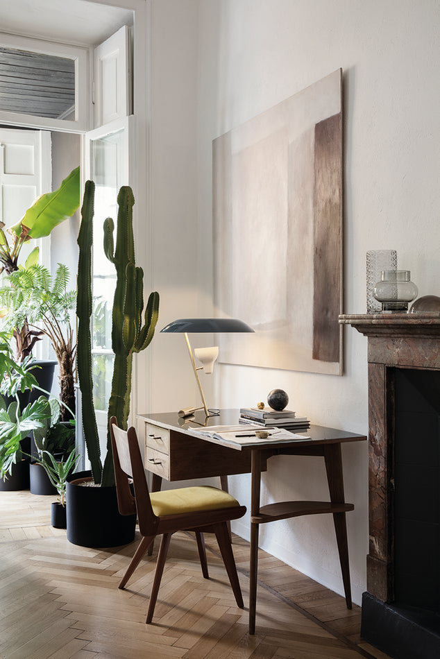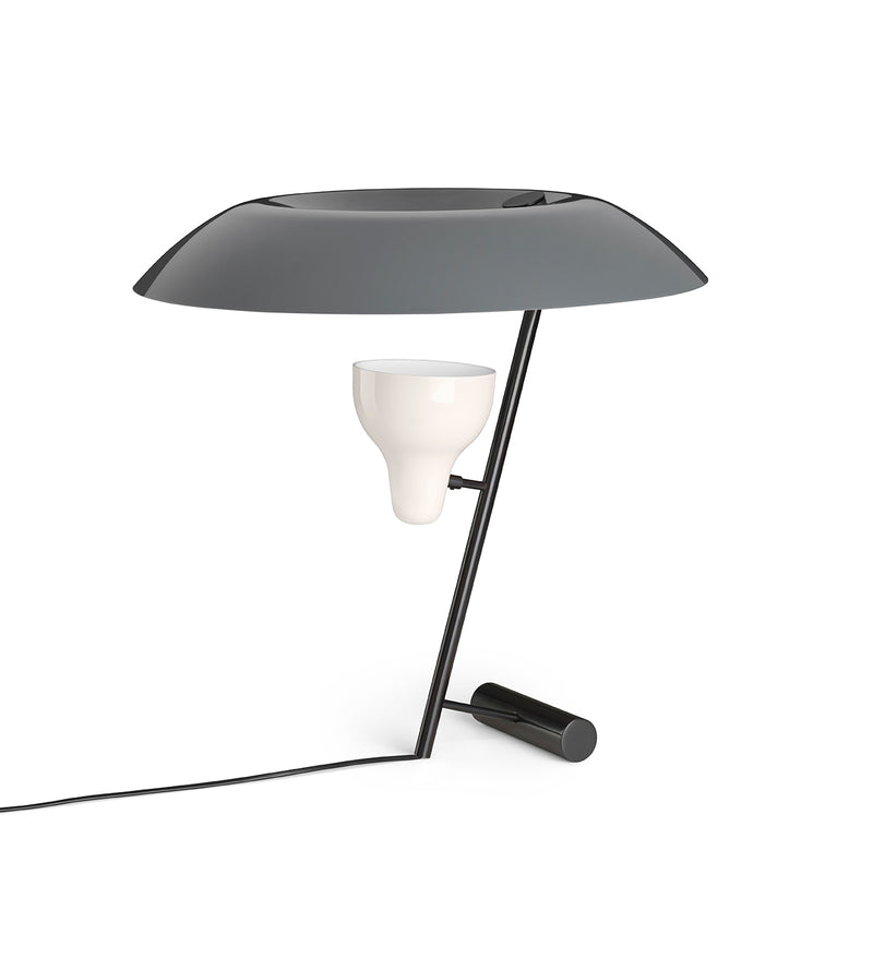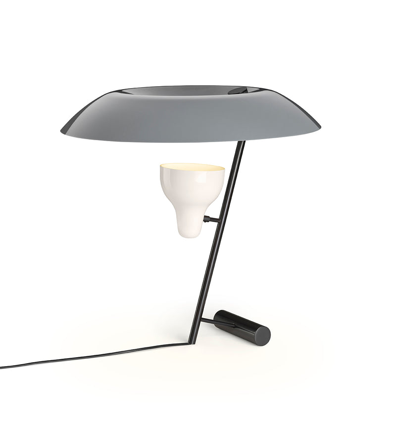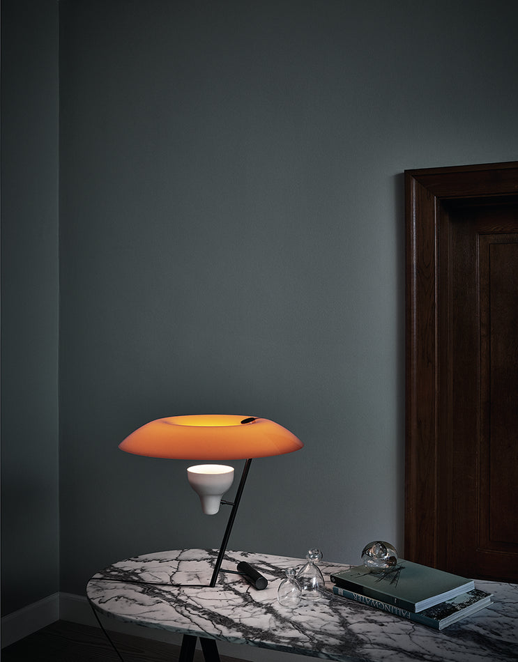 The table lamp designed in 1951 is a study in balance and light reflection through a screen, a recurring theme in Gino Sarfatti’s work. Model 548 provides both reflected and diffused light due to the adjustable spotlight that is directed up towards a reflecting screen.