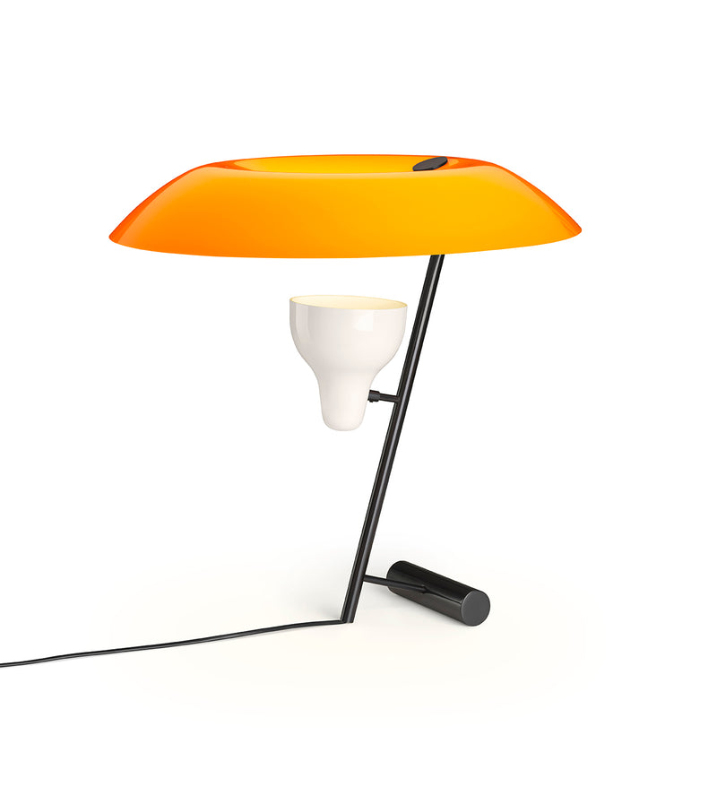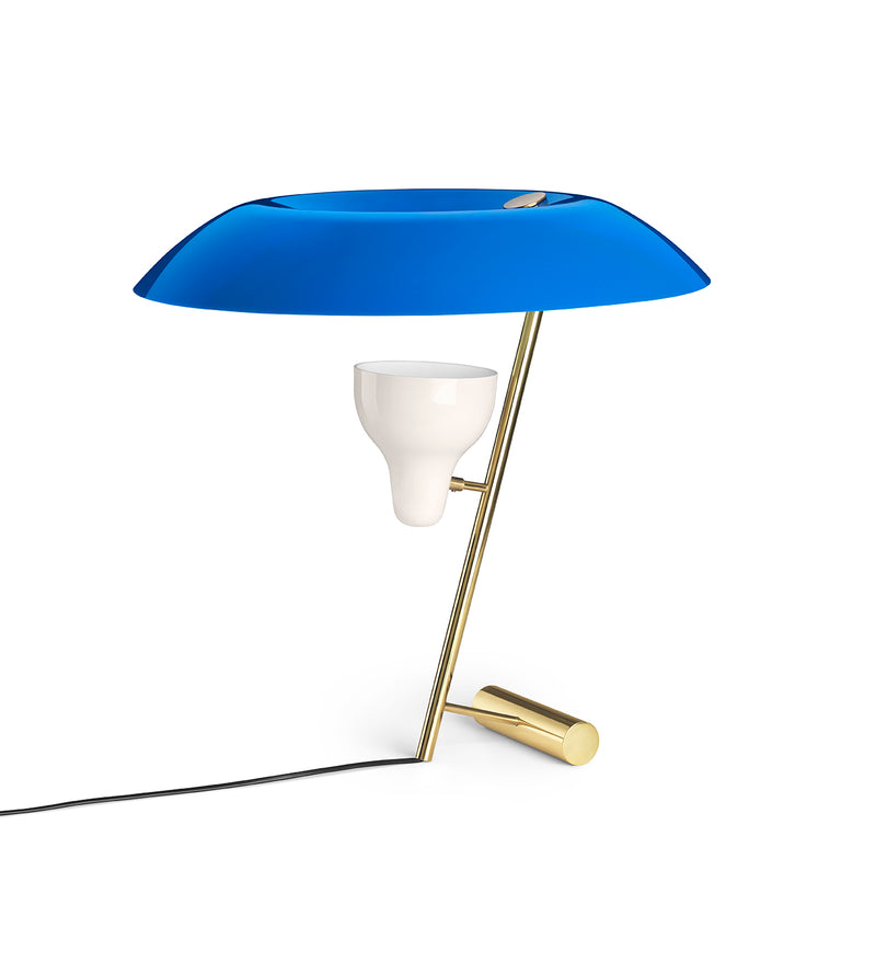 The large diffuser in orange, blue or white methacrylate provides a highly sophisticated light effect and is an essential part of the illusion and the play with perception. The spotlight in white painted aluminium is mounted on a tubular stem in polished or burnished brass, while a small brass bar at the base serves as a counterweight in the beautiful balancing act of the individual elements of Model 548.