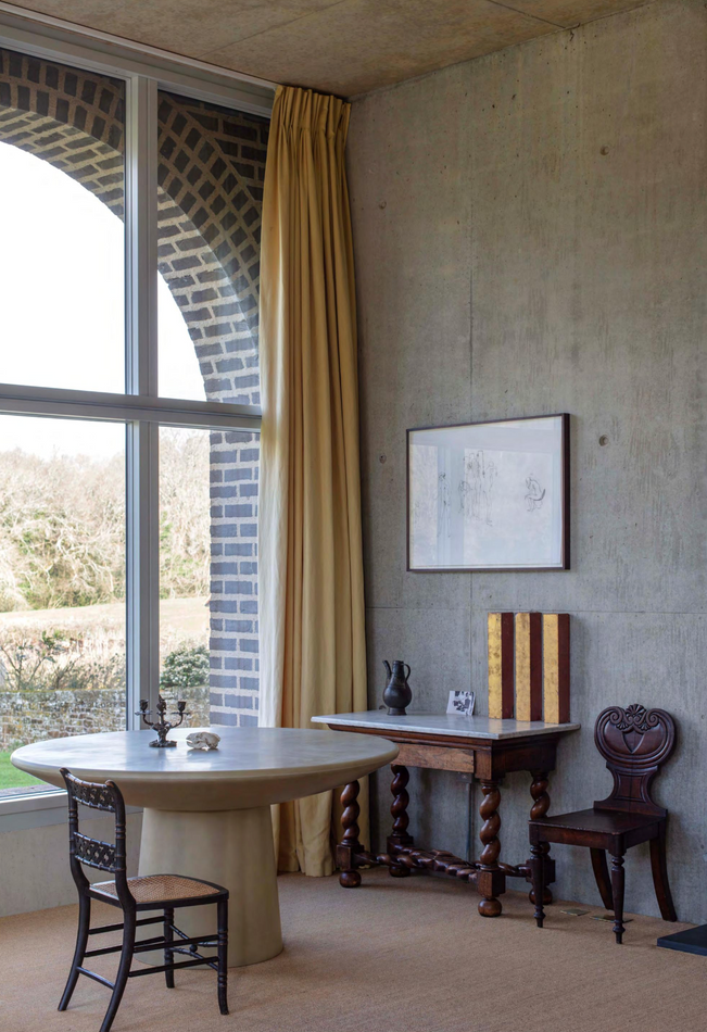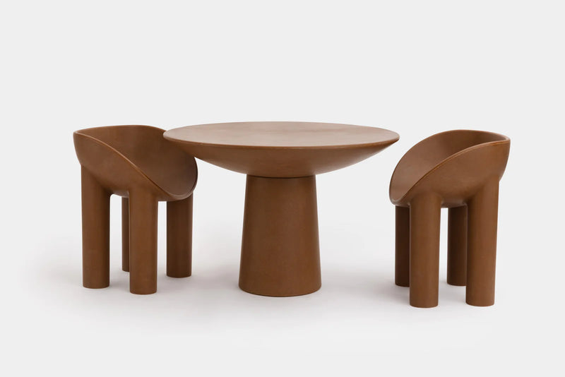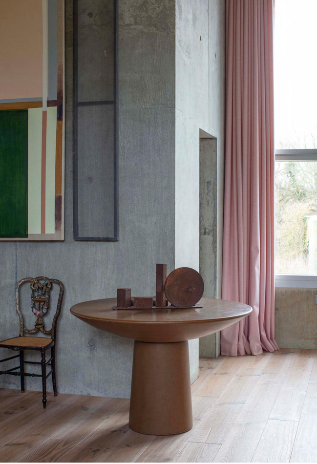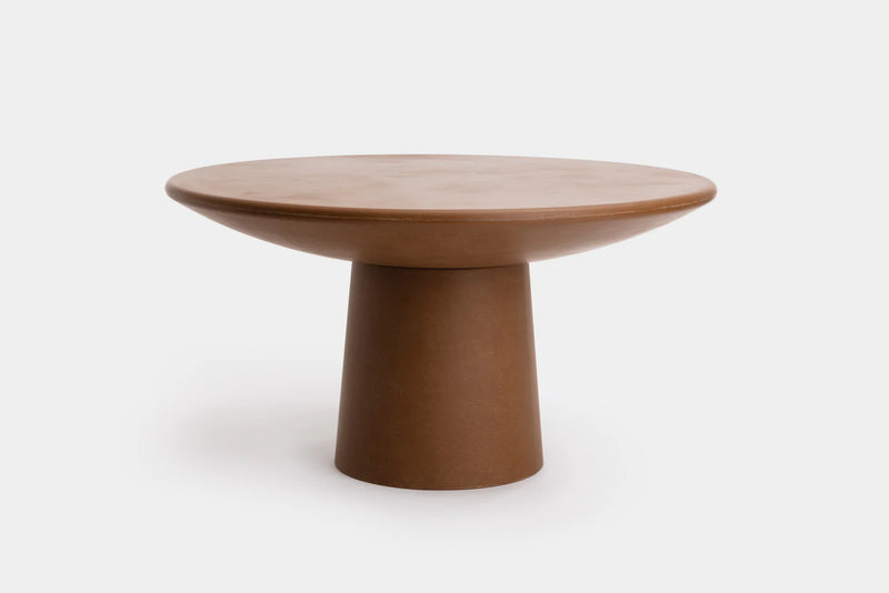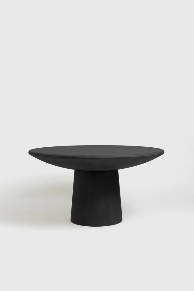 A graphic linear piece, this tapered pedestal table grows out of a wide base. It is manufactured as a continuous form in raw layered fibreglass.