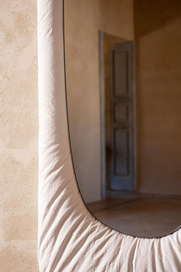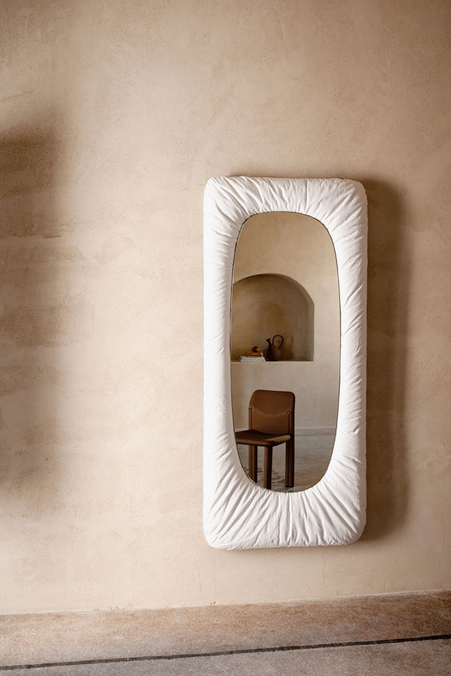 Stellar takes the form of a mirror embedded in a cushion. Designed by Faye Toogood, it reflects the materials and shapes used throughout Cosmic – the collection from the studio in collaboration with Tacchini – as well as the informal and playful style of the designer. Her groundbreaking creativity reinterprets Tacchini's traditional upholstery and transforms it into a tactile and soft structure, ready to embrace the hard, shiny surface of a mirror.
