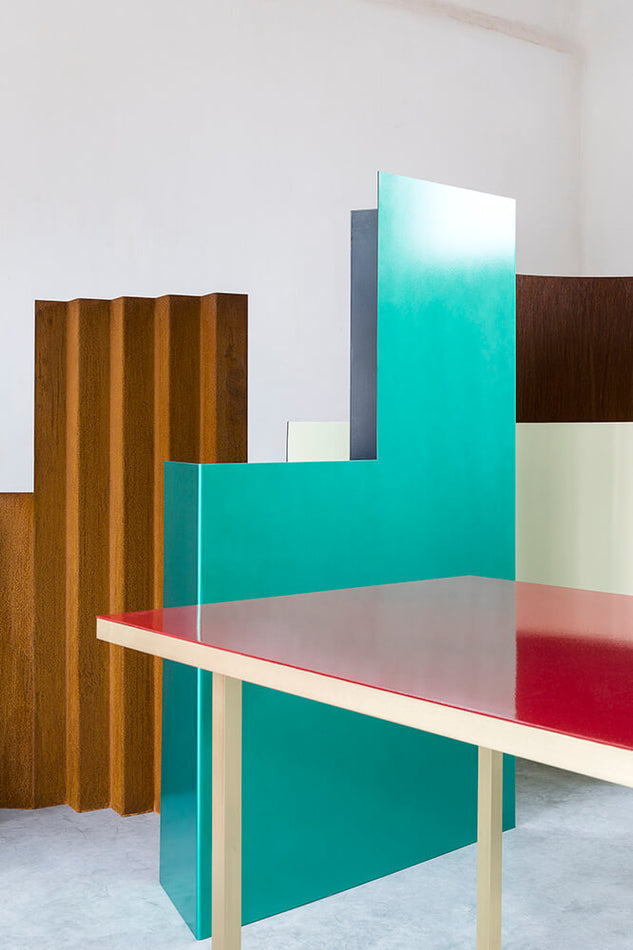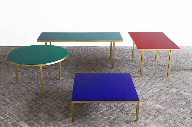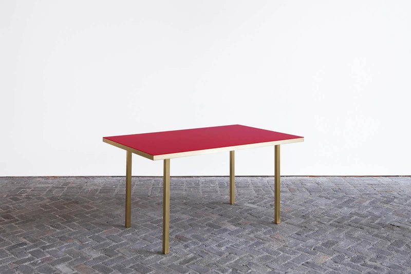 Table emaille #2 is part of the Fireworks series for which Muller Van Severen use the traditinal technique of enamel in a contemporary way. The series started with several sculptural room dividers first shown at gallery Massimo De Carlo in 2017. Later adjoined by four tables and showed at Valerie Traan in Antwerp in 2018. During the process of enamelling, colored powder glass is burned onto steel at 800 degrees Celsius resulting in a beautiful, deep layer of color. Because of the highly refined finishing, Muller Van Severen applies the technique on tables as well. The surfaces show a deep and rich color and are resistant to scratching. Notice the different positioning of the legs of the tables. While the legs of table emaille #1 and table emaille #4 are welded onto the frame, the legs of #2 and #3 are put behind the frame. By combining enamel with brass, the tables obtain a certain chiqueness, without being showy or kitsch. It is all handwork done in Belgium.