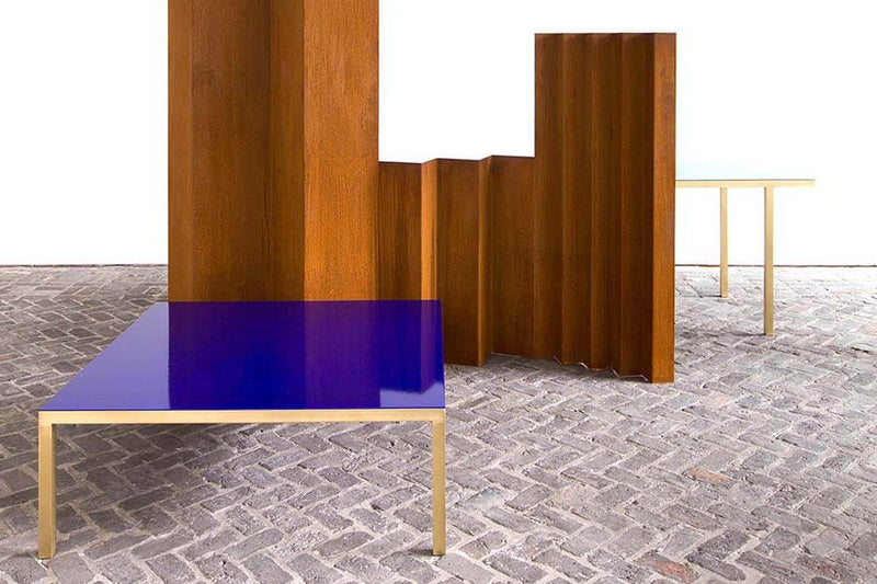 Table emaille #4 is part of the Fireworks series for which Muller Van Severen use the traditinal technique of enamel in a contemporary way. The series started with several sculptural room dividers first shown at gallery Massimo De Carlo in 2017. Later adjoined by four tables and showed at Valerie Traan in Antwerp in 2018. During the process of enamelling, colored powder glass is burned onto steel at 800 degrees Celsius resulting in a beautiful, deep layer of color. Because of the highly refined finishing, Muller Van Severen applies the technique on tables as well. The surfaces show a deep and rich color and are resistant to scratching. Notice the different positioning of the legs of the tables. While the legs of table emaille #1 and table emaille #4 are welded onto the frame, the legs of #2 and #3 are put behind the frame. By combining enamel with brass, the tables obtain a certain chiqueness, without being showy or kitsch. It is all handwork done in Belgium.