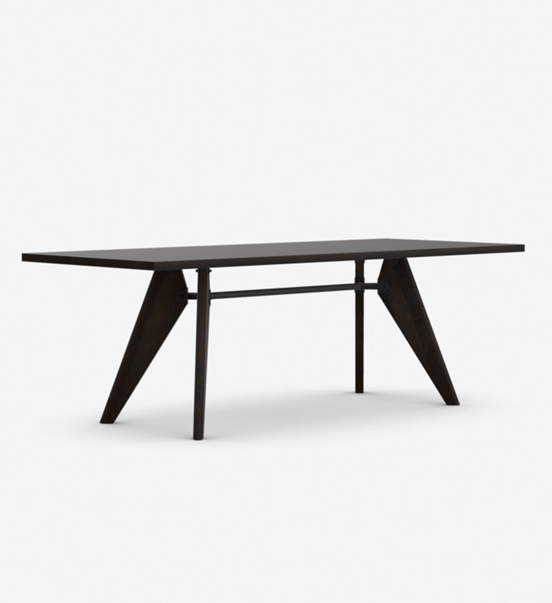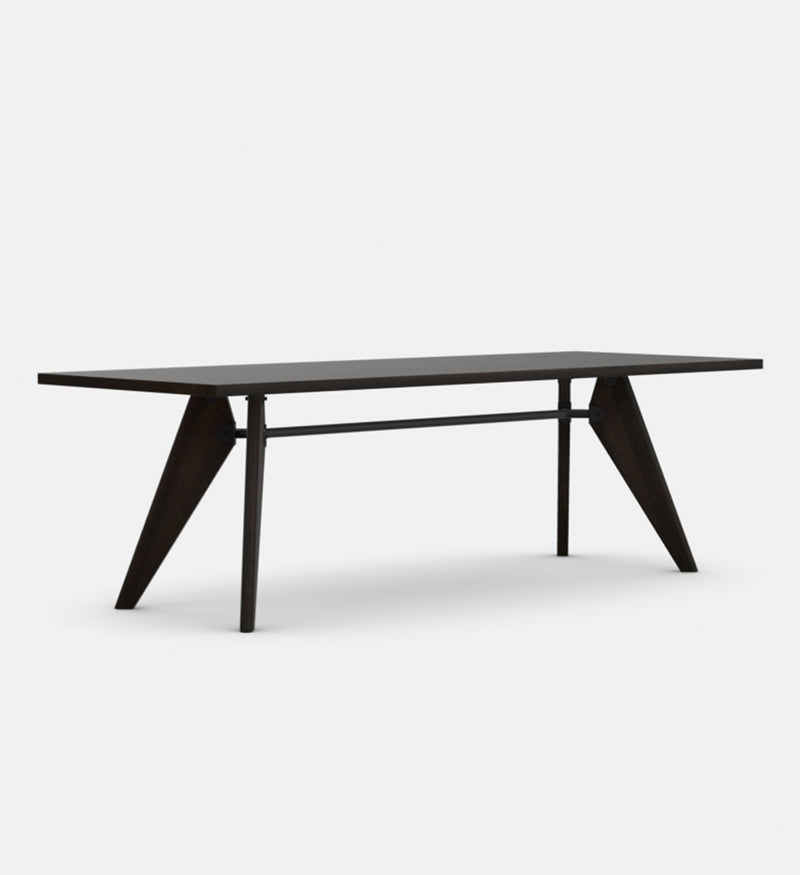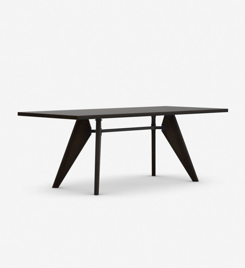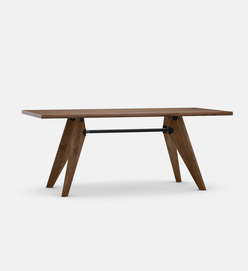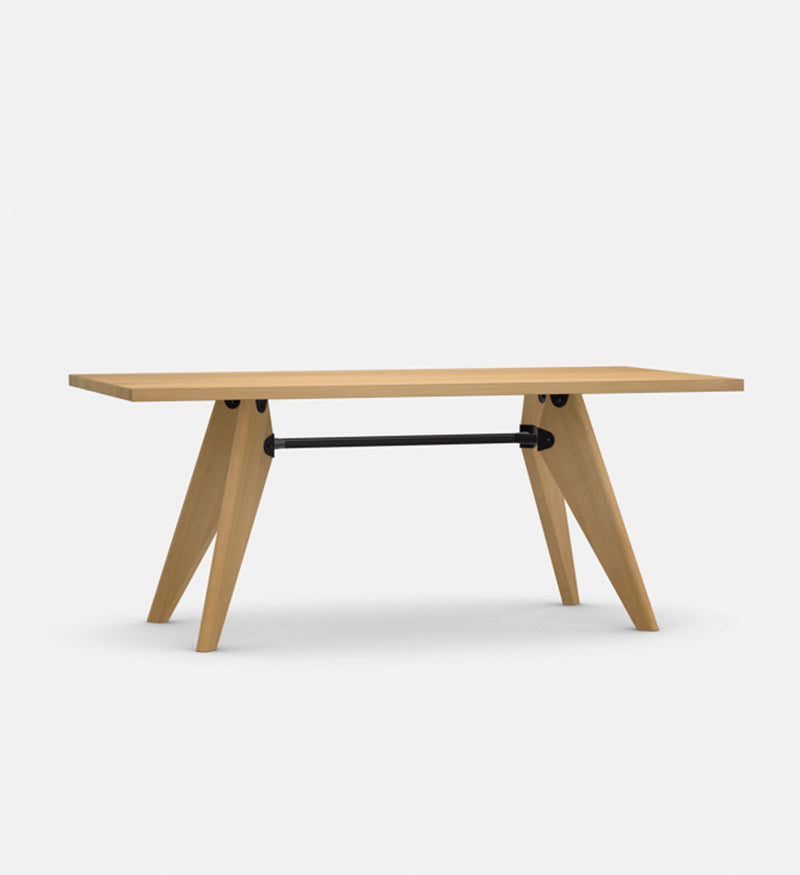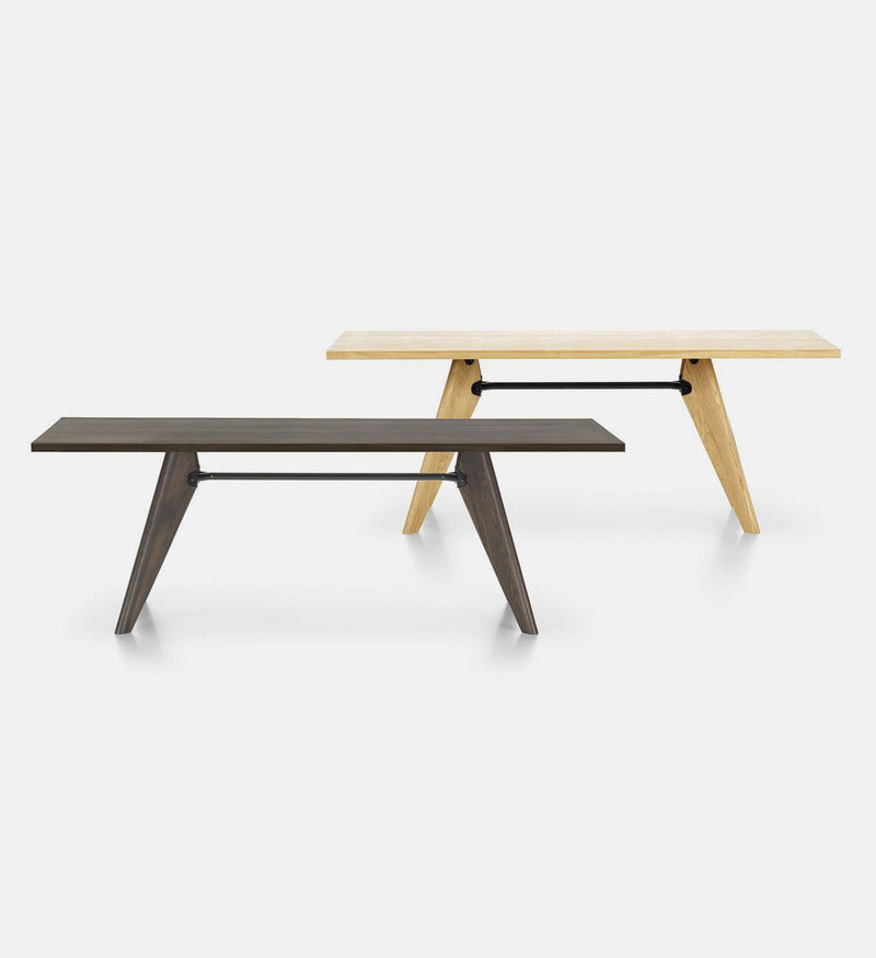 Table top: 34 mm thick; solid wood in natural oak with oiled finish, dark stained oak with protective natural lacquer finish, or American walnut with oiled finish. Base: legs matched to table top, solid wood in natural oak with oiled finish, dark stained oak with protective natural lacquer finish, or American walnut with oiled finish; tubular steel crossbar with powder-coated finish (smooth). Origin of wood: oak (Quercus robur) from Western Europe and/or Poland; American walnut (Juglans nigra) from the USA.
