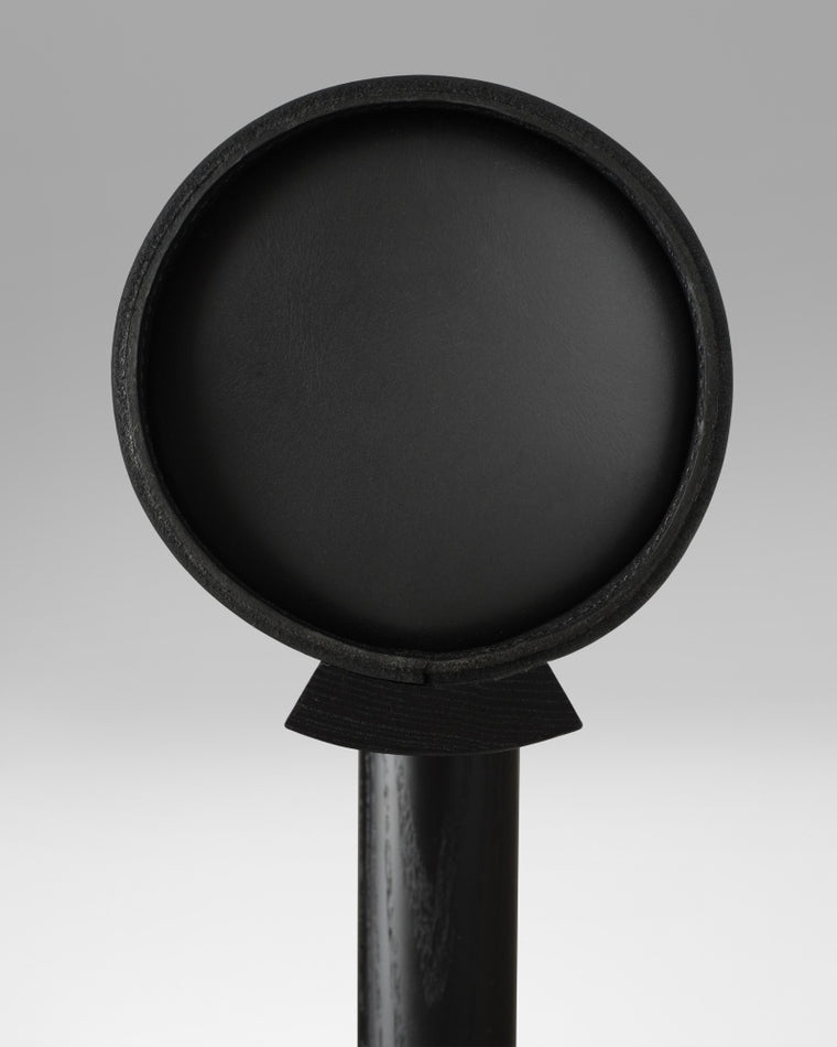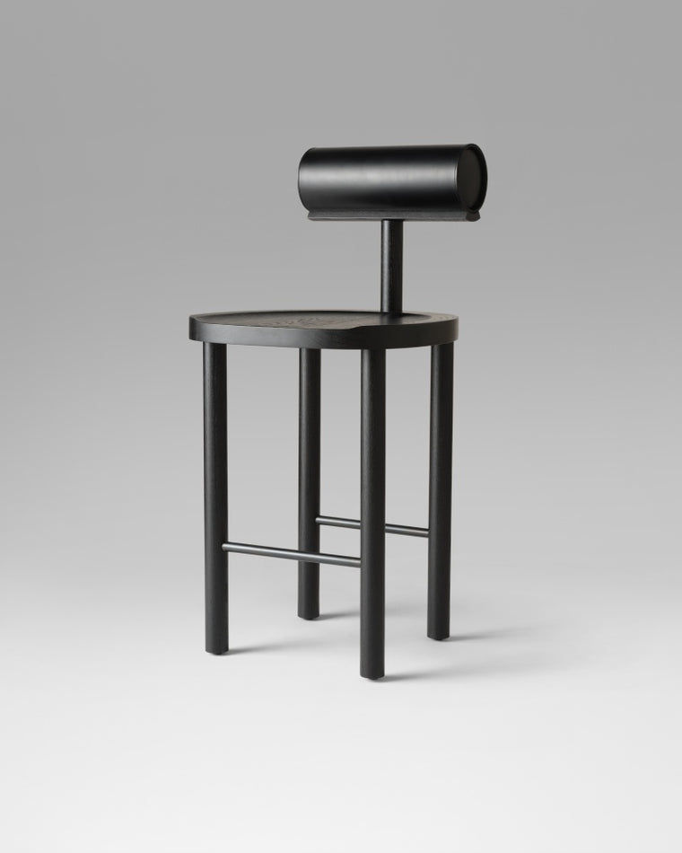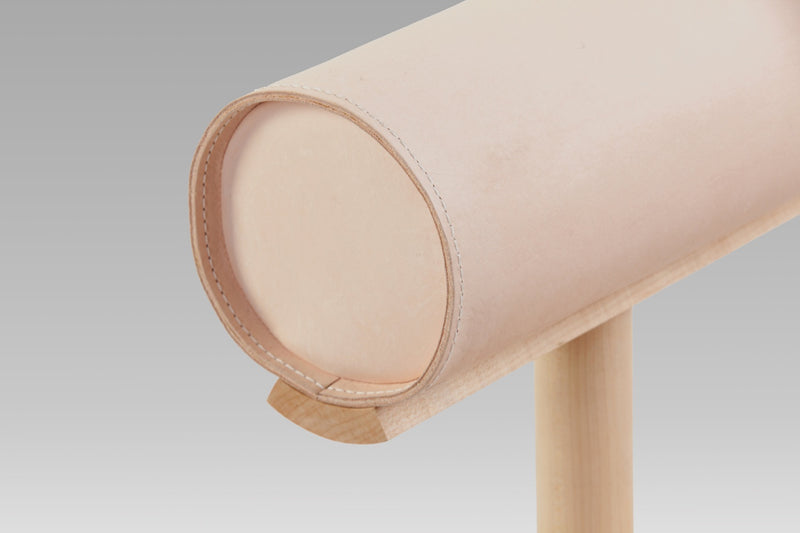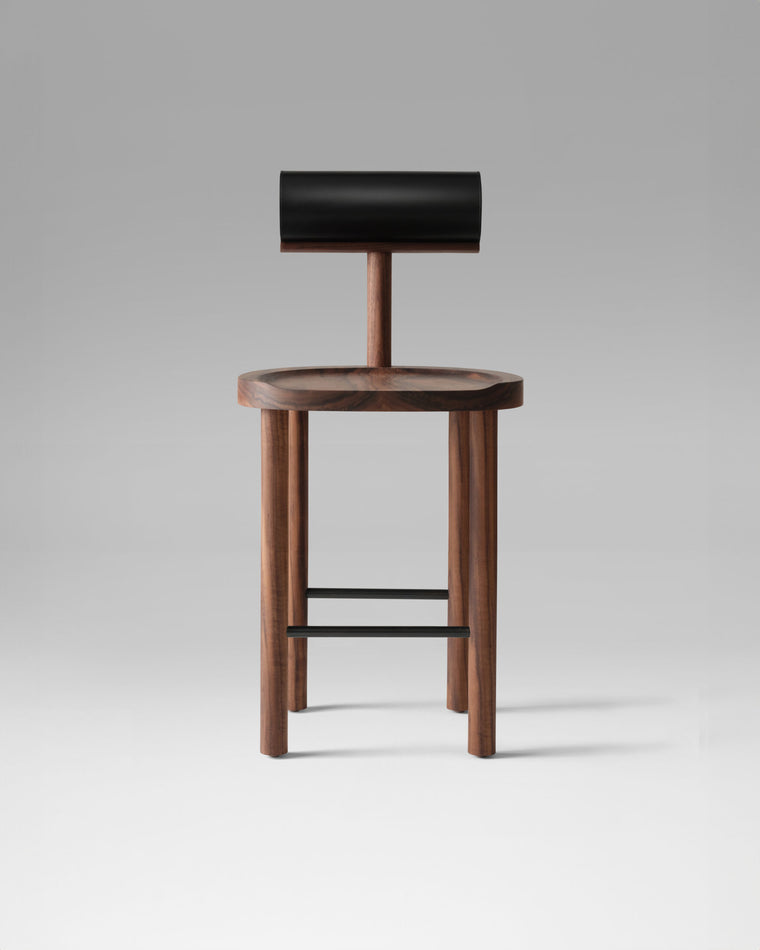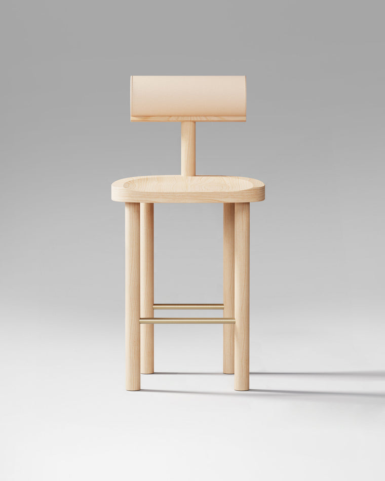 The UNA counterstool combines a curved wooden seat and legs with a leather-upholstered cylindrical back, creating a balance between comfort and simple geometry. Its design highlights the natural beauty of the wood grain and emphasizes the craftsmanship of the leather upholstery. It's a piece that embodies both form and function. Customizations available upon request. Made to order.